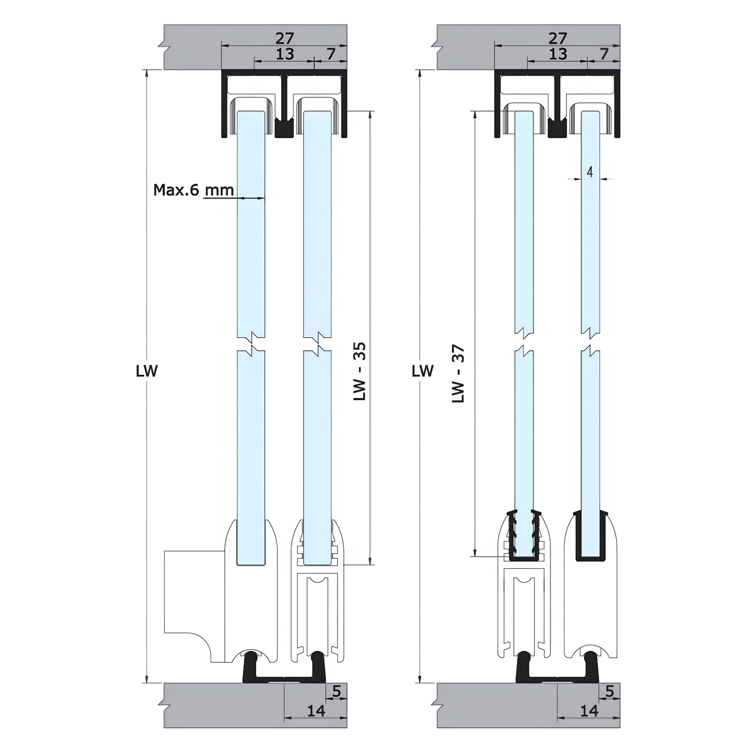 با تحمل وزن ۲۵ کیلوگرم، این مکانیزم برای انواع شیشههای نازک و سبک ایدهآل است. برای شیشههای با ضخامت ۴ تا ۶ میلیمتر، این سیستم بهترین عملکرد را از خود نشان میدهد. این ویژگی آن را برای ساخت دربهای کشویی ویترین، دربهای شیشهای کابینت، و حتی پارتیشنهای شیشهای سبک بسیار مناسب میسازد. همچنین، این مکانیزم برای نصب دو درب به صورت همزمان طراحی شده است که در فضاهای با عرض ۳ متر، امکان استفاده از دو درب را فراهم میسازد.