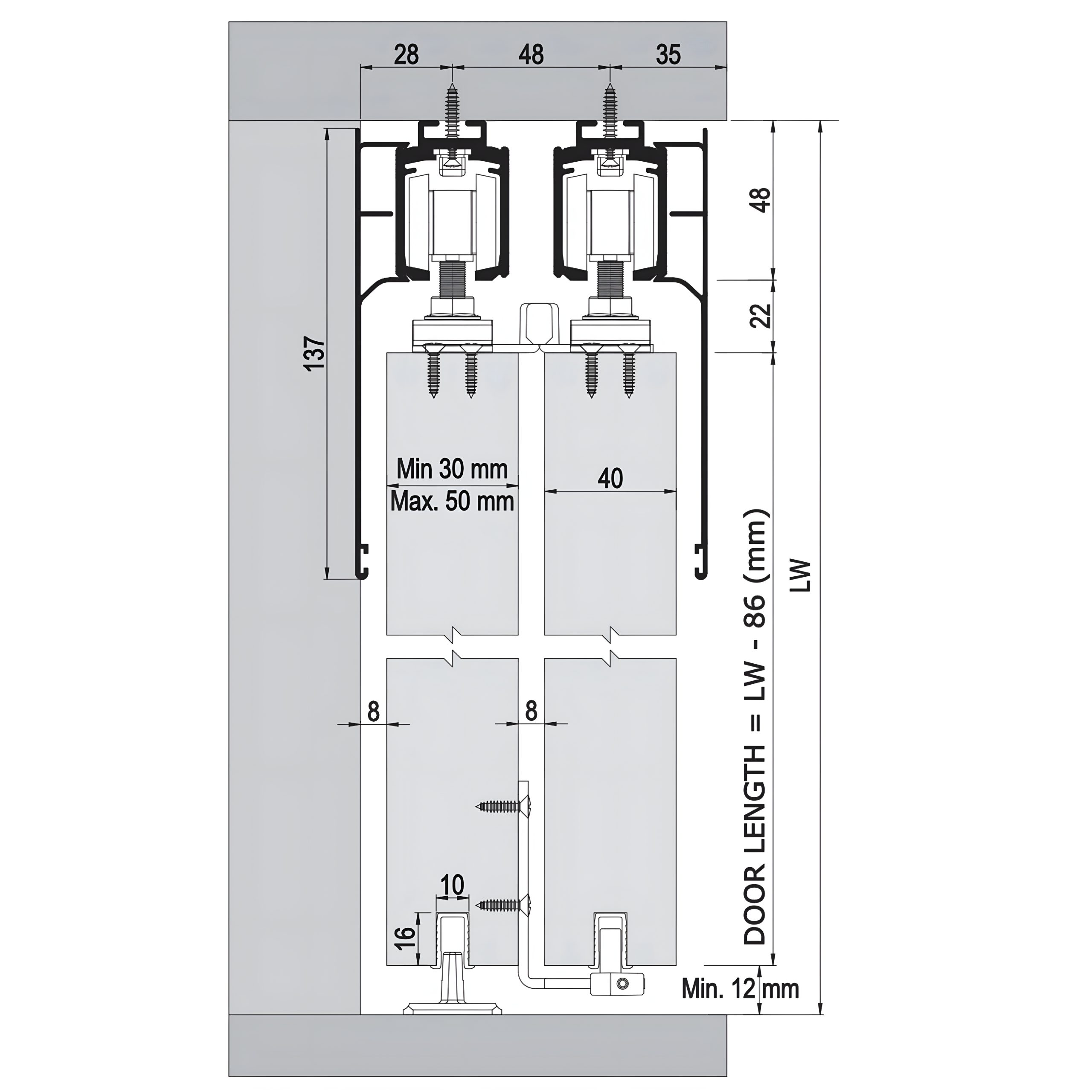 این مکانیزم برای دربهایی با ضخامت ۳۰ تا ۵۰ میلیمتر مناسب است و امکان نصب بر روی یک درب ثابت همراه با دو یا سه درب متحرک را دارد. وجود آرامبند باعث میشود دربها به نرمی و بدون ایجاد صدا بسته شوند و طول عمر یراقآلات نیز افزایش یابد.