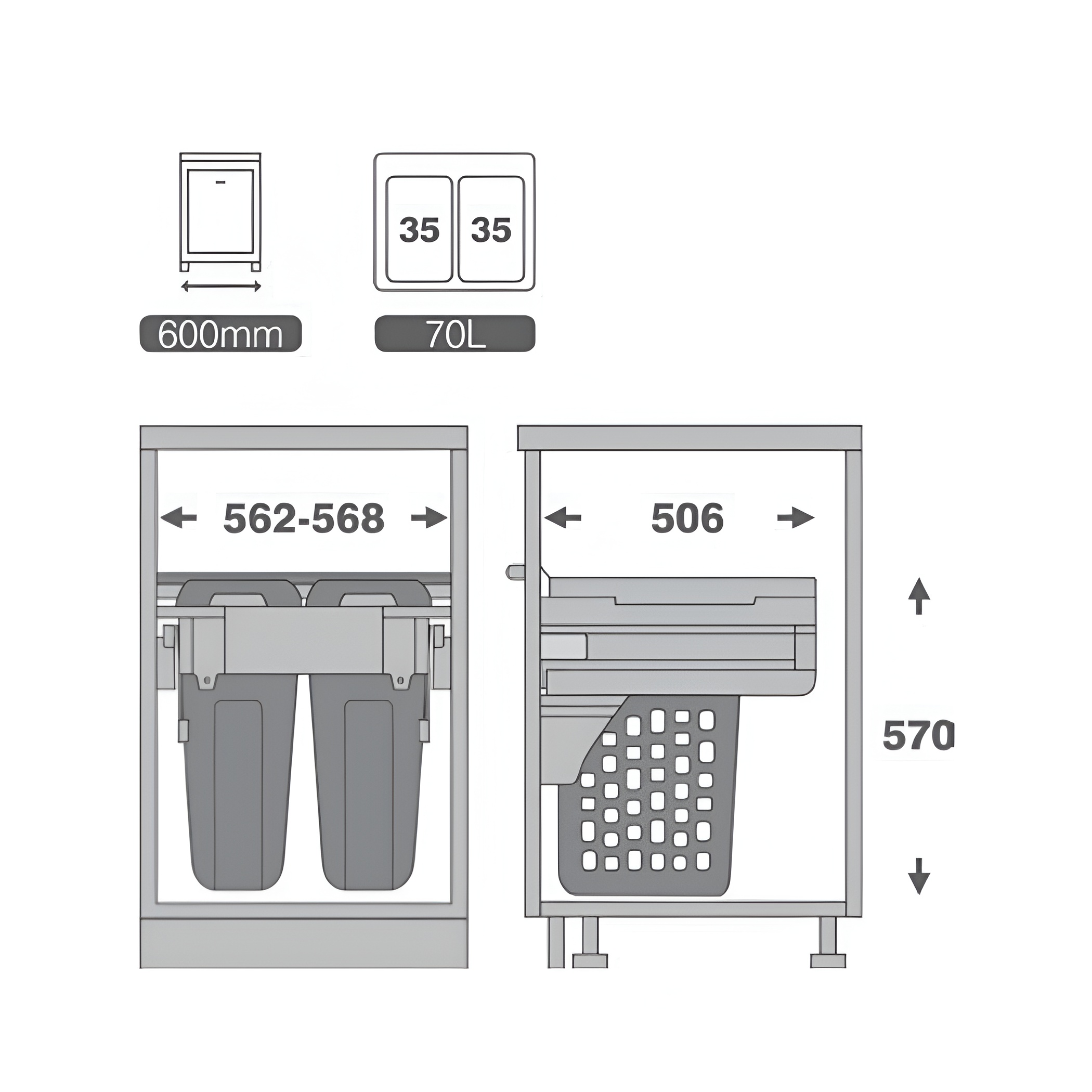یکی از نقاط قوت اصلی این محصول، ترکیب ظرفیت مناسب با طراحی کاربرپسند است. حجم کل ۷۰ لیتر، مناسب خانوادههای متوسط و پرمشغله است و دو مخزن مستقل امکان جداسازی آسان لباسها را فراهم میکند. نصب آسان بر روی یونیت کابینت و درب، بهرهوری فضای آشپزخانه را افزایش میدهد و ظاهر کابینتها در حالت بسته کاملاً یکپارچه و مرتب به نظر میرسد.