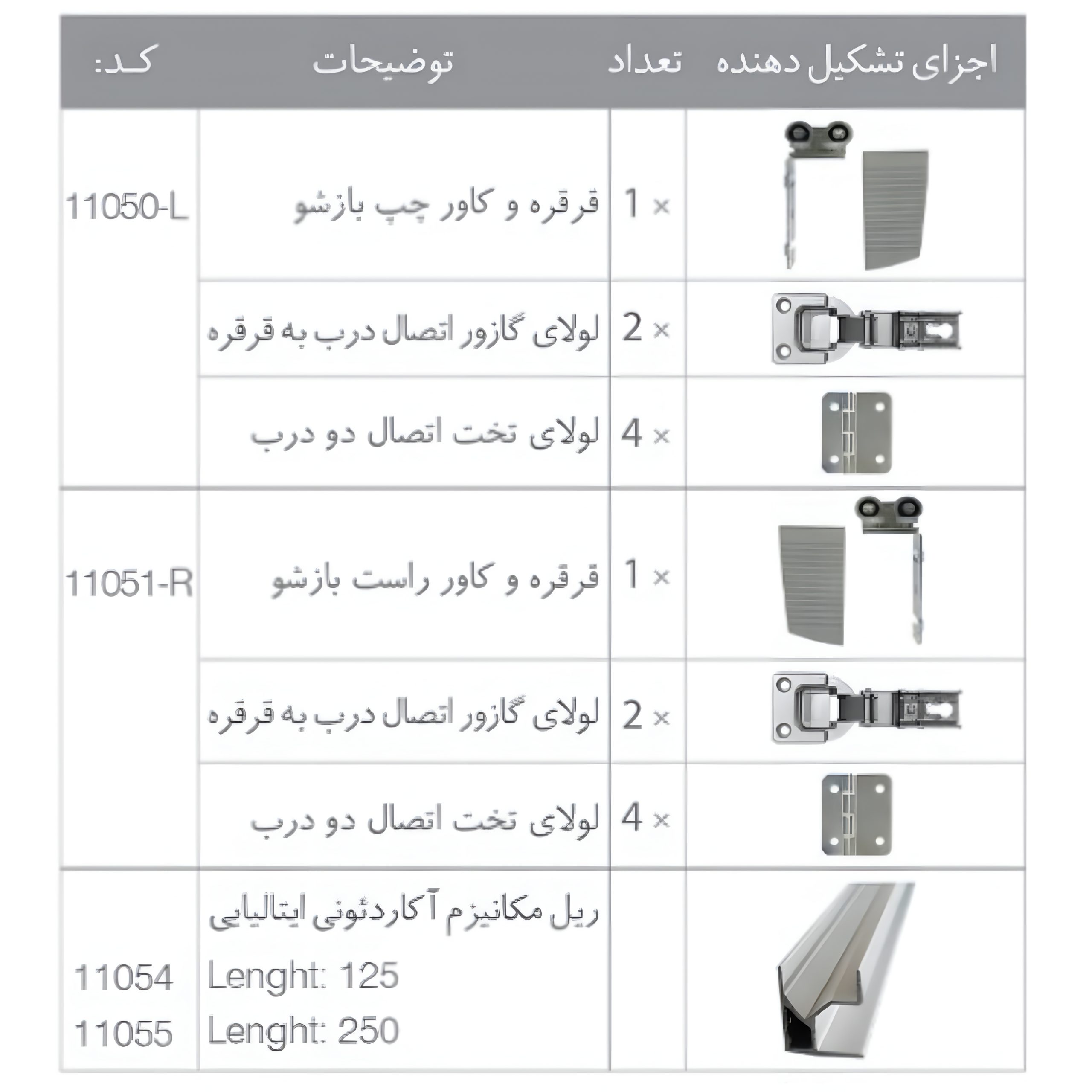پکیج کامل یراق درب تاشو بدون ریل پایین شامل تمامی قطعاتی است که برای یک نصب کامل و موفق به آنها نیاز دارید. این پکیج شامل موارد زیر است: