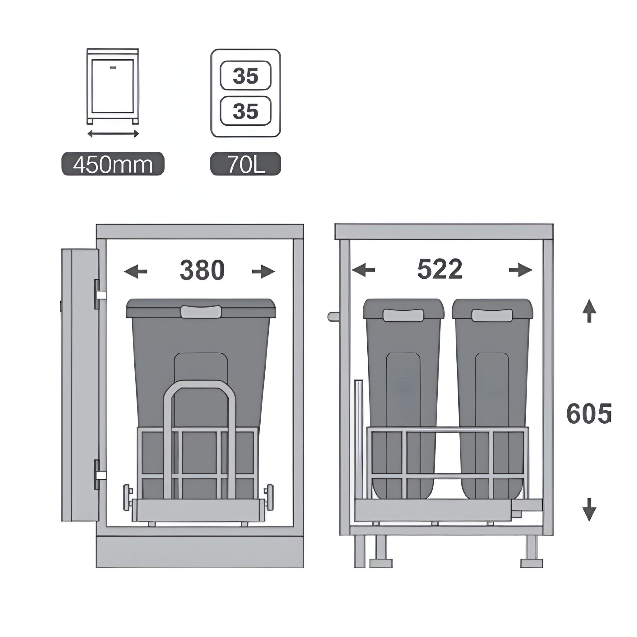 سطل زباله ریلی داخل کابینت دو مخزن 70 لیتری ملونی مدل 9028